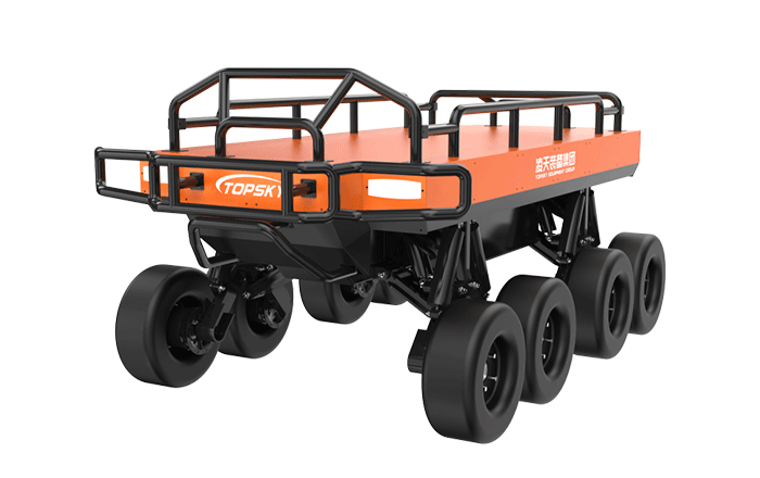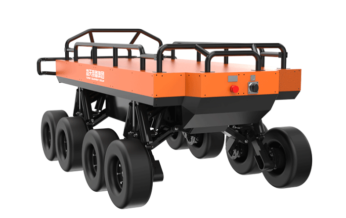 為應(yīng)對(duì)野外山地、叢林、泥濘等非結(jié)構(gòu)化地形,采用8輪與獨(dú)立懸掛的輪式底盤,平穩(wěn)適配崎嶇場地,穩(wěn)定穿越 陡坡、臺(tái)階、沙石地等,彌補(bǔ)輪式機(jī)器人在復(fù)雜地形的短板。同時(shí)可在 - 20℃至 50℃的寬溫區(qū)間穩(wěn)定作業(yè)。