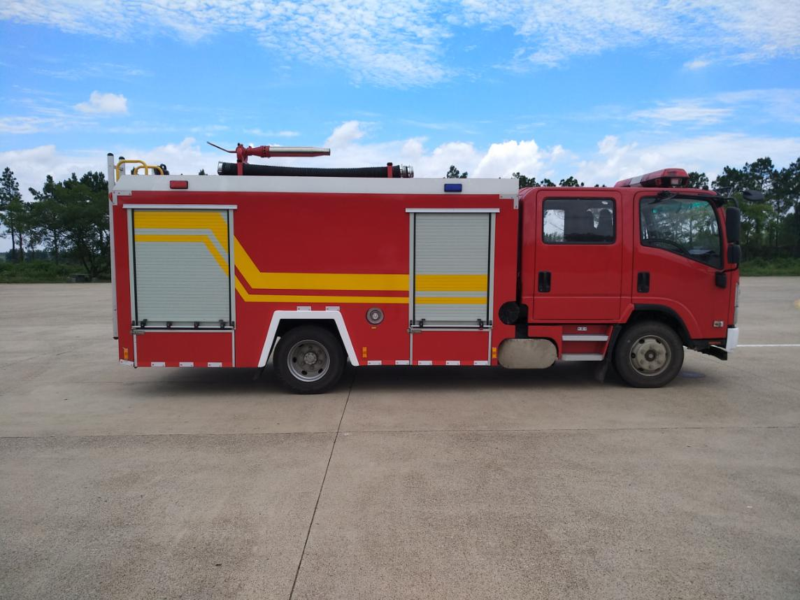 CLW5100GXFSG35/QL型水罐消防車,采用重慶五十鈴700P,型號QL1110ANKAY二類底盤改裝而成。整車由消防員乘員室和車身兩大部分組成,乘員室為雙排駕駛室,可乘坐 3+3 人,該車為外露罐結(jié)構(gòu),車身前部為器材箱,中部為水罐,后部為泵房。載液罐體為優(yōu)質(zhì)碳鋼,內(nèi)部噴涂環(huán)氧底漆及環(huán)氧瀝青漆,與底盤采用彈性連接,載水量3550kg,裝備了CB20.10/15.30中低壓消防泵,額定流量15/30 L/S,車頂安裝PS30-50D型消防炮。該車最大的特點是載液量大、操控性好、維修簡便??蓮V泛應(yīng)用于公安消防隊、廠礦企業(yè)及社區(qū)、碼頭等場所,撲救大型油類火災(zāi)和一般物質(zhì)火災(zāi)。