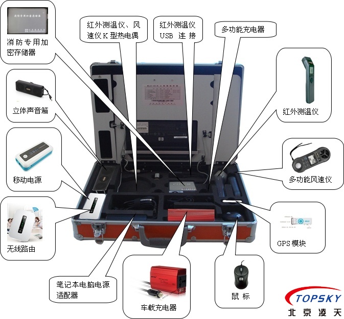 整套設(shè)備包括:筆記本電腦、紅外測(cè)溫儀、多功能風(fēng)速儀、GPS模塊、消防專用加密存儲(chǔ)器、立體聲音箱、無線路由器、電源系統(tǒng)、鼠標(biāo)、車載充電器、移動(dòng)電源、筆記本電腦適配器、便攜箱、防水迷彩袋;