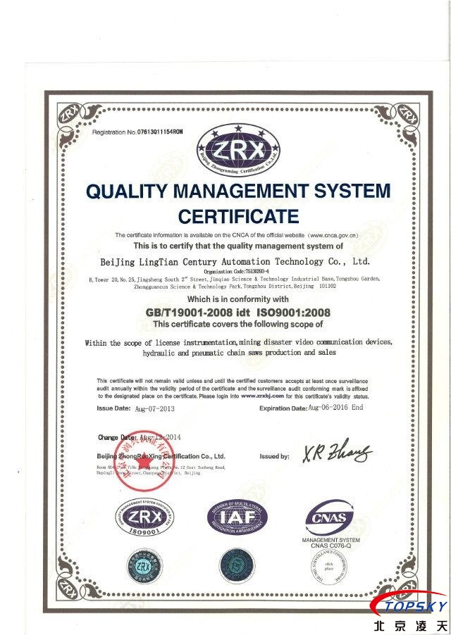 經(jīng)過(guò)嚴(yán)格的評(píng)審,我司近期按照GB/T19001-2008質(zhì)量管理體系要求,已經(jīng)取得ISO9001質(zhì)量管理體系認(rèn)證,認(rèn)證的獲得,標(biāo)志著我司在管理體系上已經(jīng)具備較高水平。認(rèn)證證書(shū)的中英文如下: