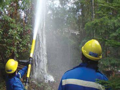 雙握把泡沫槍 可簡單、快速噴射泡沫控制現場火勢,打開混合腔的進水,塞入泡 沫棒,擰緊密封蓋,連接進 水管,就可以噴射泡沫,有 效的控制火勢。