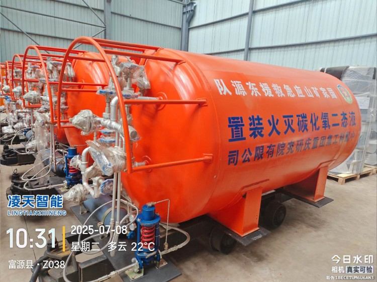 液態(tài)二氧化碳滅火裝置,采用平板車為運載平臺,搭載液態(tài)二氧化碳滅火模塊,采用液態(tài)二氧化碳為滅火劑,運輸至井下火區(qū)近附,經(jīng)自增壓調控系統(tǒng)實現(xiàn)罐內穩(wěn)壓,并通過遠距離輸送管路將液體從罐內向密閉火區(qū)噴射,利用其急速膨脹氣化和吸熱效率高的物理特性,可實現(xiàn)惰性降氧,吸熱降溫,吸附阻化等功能,從而可快速進行井下煤層自燃火災的預防與撲滅等。