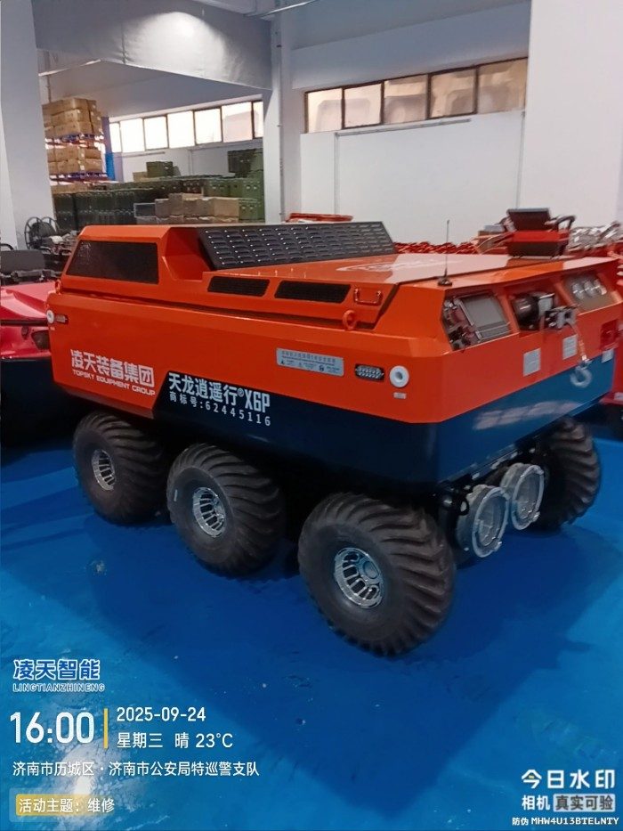 水陸兩棲 采用6×6輪式+履帶底盤,液壓驅(qū)動(dòng),水陸兩棲,可全地形行駛??稍谒掀⌒羞M(jìn),適合多種救援場(chǎng)景,輪胎+履帶兩用底盤(履帶可快速拆裝)。