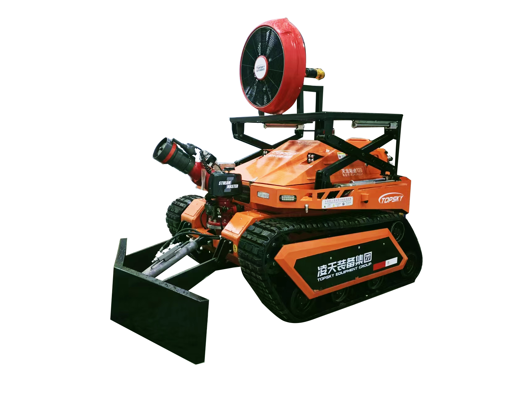 消防排煙滅火機(jī)器人是一款履帶式中型油動(dòng)力消防滅火機(jī)器人,采用柴油發(fā)動(dòng)機(jī)為動(dòng)力,閉式液壓系統(tǒng)驅(qū)動(dòng)ASV橡膠履帶進(jìn)行高速行走,搭載了每秒120升的大流量消防炮,具有60000m3/h的可升降大流量水力排煙機(jī),及V型推鏟,攜帶多種檢測(cè)、監(jiān)控傳感檢測(cè)裝置,對(duì)火災(zāi)場(chǎng)所實(shí)施遠(yuǎn)程實(shí)時(shí)監(jiān)控,進(jìn)行火災(zāi)撲滅、煙霧及有毒有害氣體驅(qū)散,道路開辟清障。