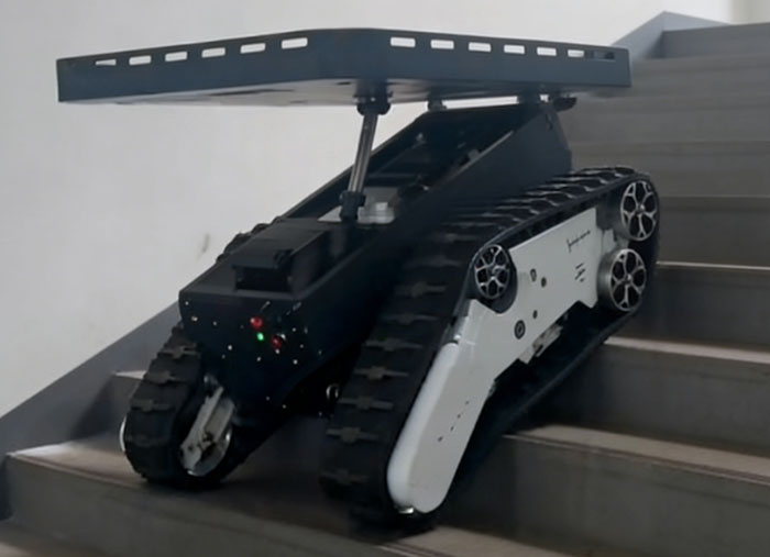 其以 “強適應性 + 高智能” 為核心優(yōu)勢:底盤采用橡膠橫紋履帶與先進避震系統(tǒng),搭配輕量化一體壓鑄鋁輪及耐用材質(zhì),可實現(xiàn)常規(guī)爬坡、極限爬坡,適配多地形穿行,保障復雜環(huán)境穩(wěn)定運行。