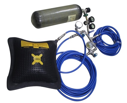 高壓氣瓶通過壓力調(diào)節(jié)器(減壓閥)的減壓,將25MPa的高壓空氣降低到0.8MPa低壓空氣,0.8MPa低壓空氣通過雙向控制器連接兩個(gè)氣墊或兩個(gè)氣囊,可完成兩組起重操作。控制器由雙向控制器和單向控制器兩種類型,顧名思義,雙向控制器可連接兩個(gè)氣墊或兩個(gè)氣囊,單向控制器可連接1個(gè)氣墊或1個(gè)氣囊。氣囊與氣墊的區(qū)別為,氣囊起重力小,起重高度高,氣墊剛好相反。