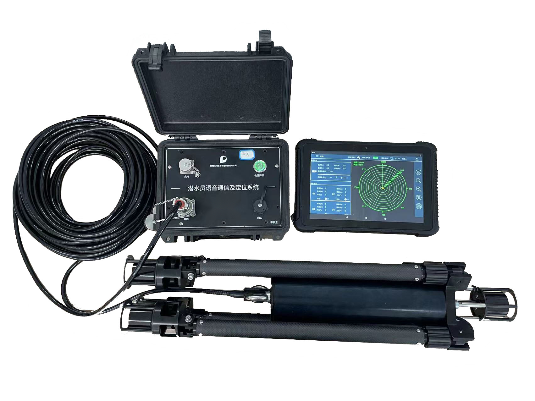 用于潛水員語音、數(shù)字通信及定位,具備水面指控系統(tǒng)、水面定位基陣、 水下潛水員單兵穿戴和顯示系統(tǒng)。通信距離1000-1500m,工作深度≥60m。