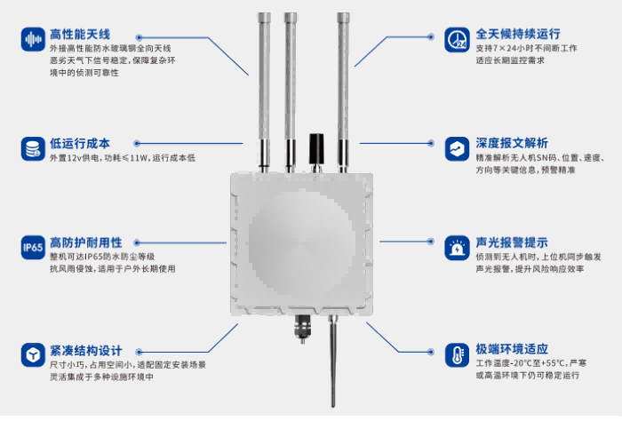 1.該產(chǎn)品是一款集成多種通信模式和能源供應(yīng)的智能無人機探測設(shè)備,采用外置玻璃鋼全向天線,可以對市面上常見消費級無人機實現(xiàn)精準預警;