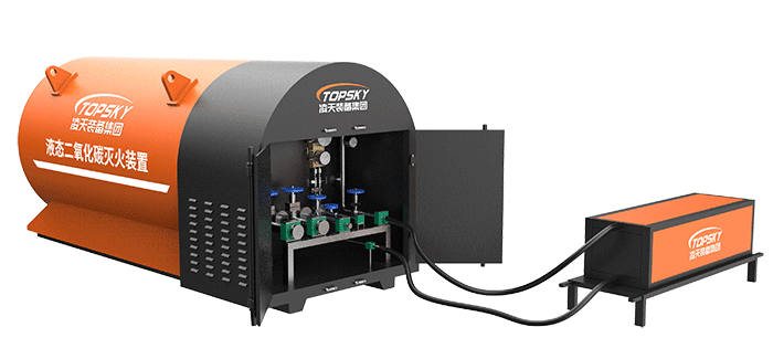 液態(tài)二氧化碳滅火裝置,采用平板車為運(yùn)載平臺,搭載液態(tài)二氧化碳滅火模塊,采用液態(tài)二氧化碳為滅火劑,運(yùn)輸至井下火區(qū)近附,經(jīng)自增壓調(diào)控系統(tǒng)實(shí)現(xiàn)罐內(nèi)穩(wěn)壓,并通過遠(yuǎn)距離輸送管路將液體從罐內(nèi)向密閉火區(qū)噴射,利用其急速膨脹氣化和吸熱效率高的物理特性,可實(shí)現(xiàn)惰性降氧,吸熱降溫,吸附阻化等功能,從而可快速進(jìn)行井下煤層自燃火災(zāi)的預(yù)防與撲滅等。