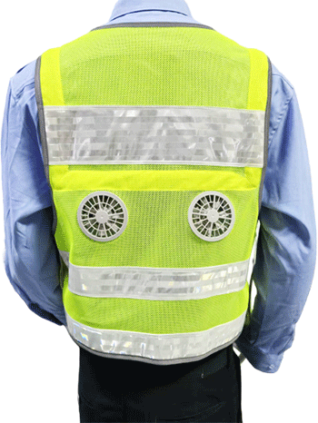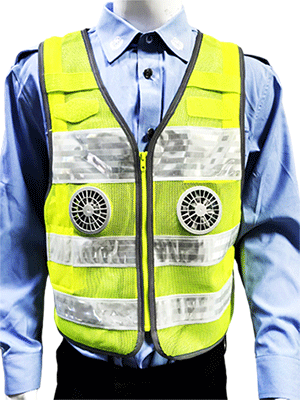 溫控警用背心(低溫型)為前開襟馬甲式樣,開襟用拉鏈拉開,前后身分別具有兩道橫向反光帶;前身胸部左右分別綴釘胸微、警號錦絲搭扣帶絨面、對講機袢、前后身兩側用錦絲搭扣及銅制四合扣連接,針對不同腰圍三檔調節(jié)肥瘦;可根據(jù)不同身高調節(jié)長短